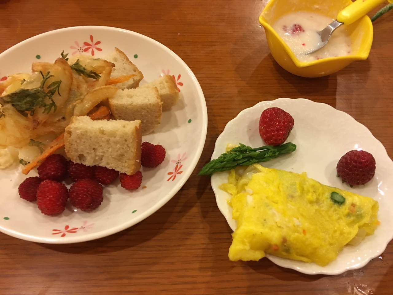 而大人们则是各自自助餐 有面包 还有蔬菜 加上各种奶酪和蜂蜜等