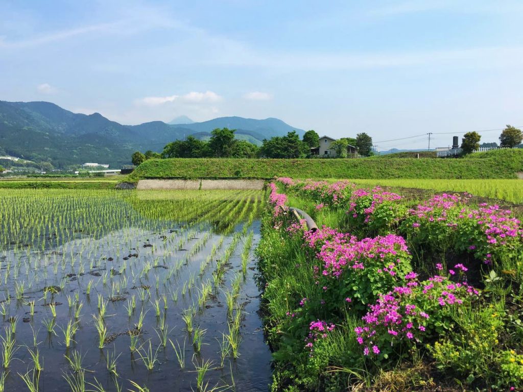绿油油的水稻旁开着艳丽的花